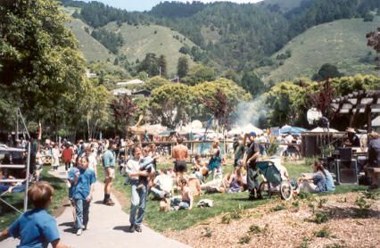 This color photo is of the crowd of people attending the Cuisine on the Green opening. Some are sitting or standing on a lawn and others are walking on the cement path. Beyond the lawn area umbrellas can be seen on the court and smoke rising from a barbecue. There are trees in the background behind which rise the coastal hills.Collection