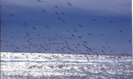 This color photo shows a stretch of ocean above which swarms of shorebirds are flying. Some skim the water while others fly high above it.Collection