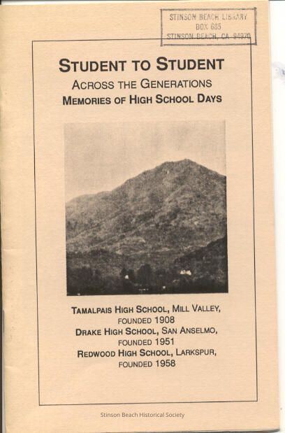 This 26 pages booklet is subtitled; Across the Generations, Memories of High School Days; Tamalpais High School, Mill Valley founded 1908; Drake High School, San Anselmo founded 1951; Redwod High School, Larkspur, founded 1958. The project directors were Ed Allen, teacher Kent Middle School and Sue Morris, trustee, Tamalpais Hich School District. It was dedicated to Tamalpais District alumni and students who participated in the project. The booklet contains interviews of old alumni graduates of 1920 to 1982 remembering their time at the High Schools. Interviews were done by alumni graduates of 1989 to 1991.