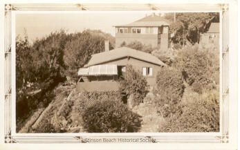 A black and white photograph of 2 houses shown setting on the hillside among trees. The house on center is Ada Marble's house. The one behind is Fischer House. Ada was active participant of affairs in the village. The photographs in this series were given to Andrea diMarco from Ada. Anderea rented her Apt.-Garage-see addition 1939, 2005-108-08. On the back of photo, it is written: Toyon Terraces, Stinson Beach, California. April8,1934.Collection