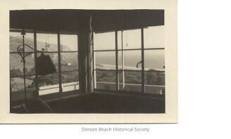 This photo shows the windows of the house taken from inside corner showing the Highway One view. A lamp stands to left. the windows had large English cut panes. On its back written Seacock, July 39. See the rest of 2005-108 series.Collection