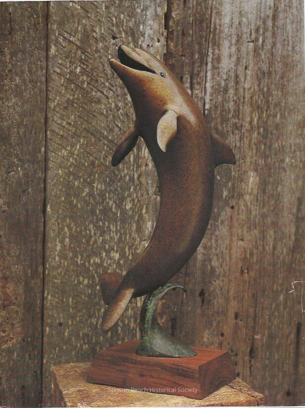 Two-page excerpt from an article on Peter Allen and his marine mammal sculptures, which appeared in the Jan-Feb 1989 issue of In-Marin magazine. These pages show mainly his sculptures in color photos but the article is incomplete. Page one shows his dolphin in bronze casting form on a redwood base. The second page shows his sculptures of a humpback whale mother sheltering its baby, 2 photos of Peter sculpting at his studio, the entry to his studio with his name on a vertical wooden nameplate beside bones of a marine mammal attached like a door knocker, and his grey whale sculpture in redwood. Included on this page are a couple of paragraphs from the article.