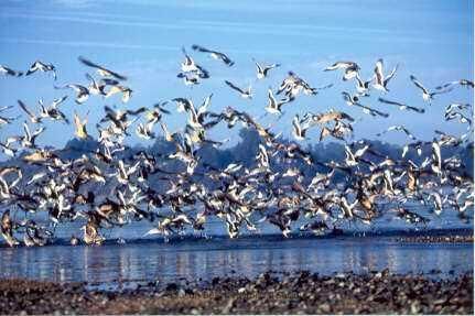 Color photo of a myriad of birds in flight over Bolinas Lagoon. Most of them are white with black or golden accents. Most are pelicans with some gulls and other shorebirds.Collection