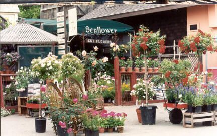 This color photo shows an outdoor flower stand tucked in beside the shingled wall of a neighboring building. There is a green canvas sunshade at the back of the display with the word Seaflower in white on the front flap. Suspended below it is a wooden sign saying Cut Flowers. To the left of the canvas is another shade structure with a peaked roof of white lath. There is a redwood and wire fence in front of these structures. Behind and in front of the fence are numerous plants with red, blue, pink, yellow and white flowers in pots on the ground, in wagons and on stands made from wooden boxes. Two ratten chairs are in the left foreground surrounded by low potted plants and white tree roses behind.Collection