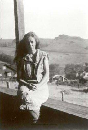 Photo of a woman in a checkered, sleeveless dress sitting on the wooden railing of the porch of the Dunn cottage on the hill in Stinson Beach. She is fair-haired and she is wearing it long and swept back over one shoulder. He hands are clasped in her lap and she is leaning against a vertical beam. In the background 2 homes are visible further down the hill and the mountain rises up beyond that.Collection