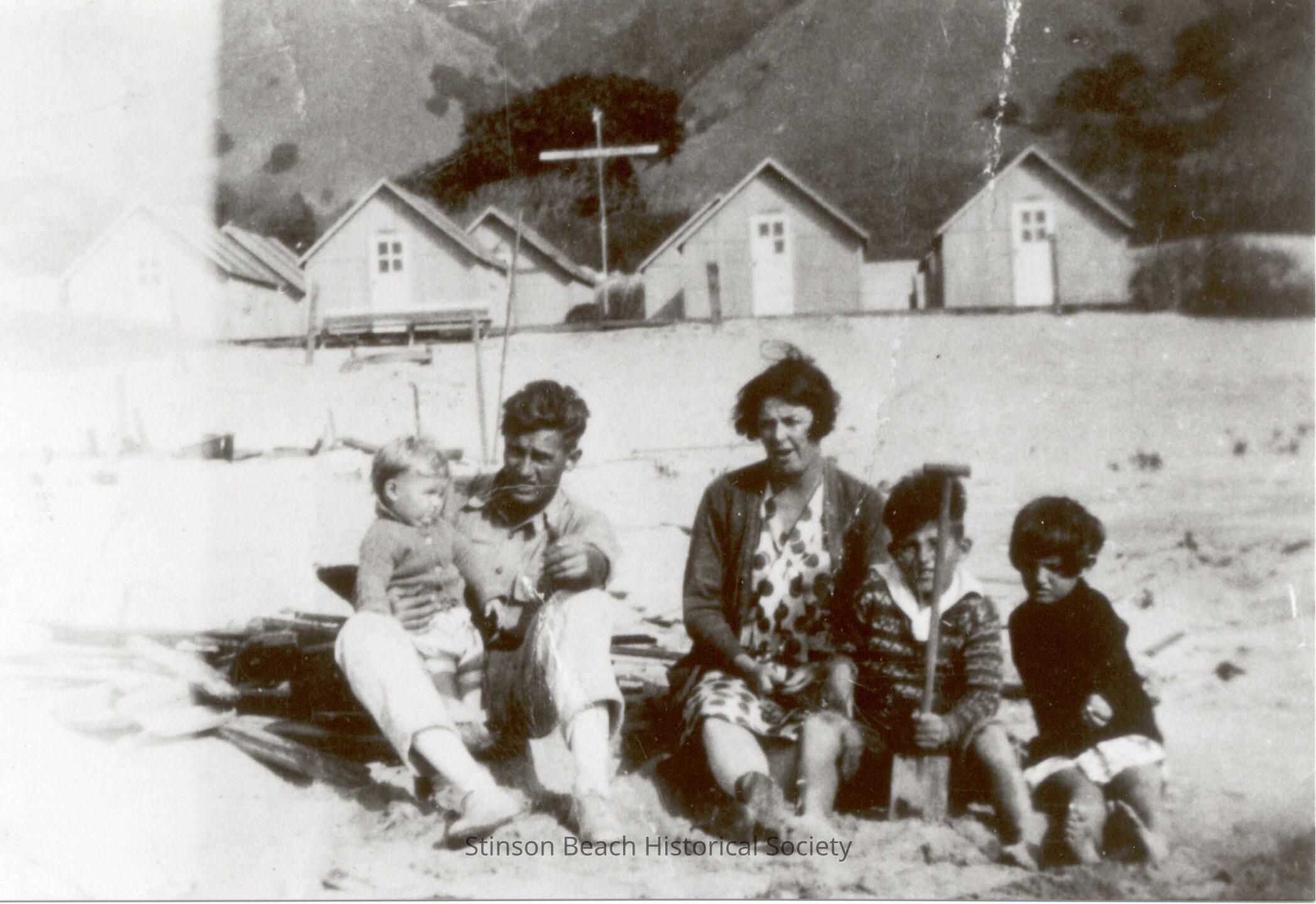 Family of 5 sits on the beach. L. to R. a fair-haired child, Billie, sits on his father's (Earl) knee; a dark-haired and very tan-looking Earl; wife Dorothy Foster Thomson in dotted dress and long cardigan and short, bobbed hair; son Dave in striped sweater and shorts holding a shovel upright in the sand; and cousin Marna in dark sweater, short white skirt and bare feet. Beyond them is a row of identical houses with A-frame roofs and single white door with 4 small windows centered in the upper part of the door.Collection