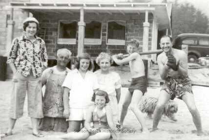 Epperson family and unidentified friends kneel or stand in front of the "Sand Castle" on the beach, which is apparently under construction. It is a brick building with 3 windows and a dark automobile is parked next to it. Location: in front of and between Calle del Pradero and Calle del Sierra. There are 8 people in the photo but only 4 names are given: Teresa, Marge, Mary and Frank (mom and dad). Dad and a young boy (both in swim trunks) stand ready to play ball on the right of the photo. Dad with the mitt and boy with the bat pulled back over his shoulder. A shaggy dog walks behind them. I presume it's mom Mary in pedal pushers, Hawaiian shirt, bowl cap standing with her hands in her pockets on the far left. Everyone else is kneeling (one girl in swimsuit is sitting in front of everyone else). This includes two girls (a blond and brunette) in white and an older white-haired gentleman in coveralls.Collection