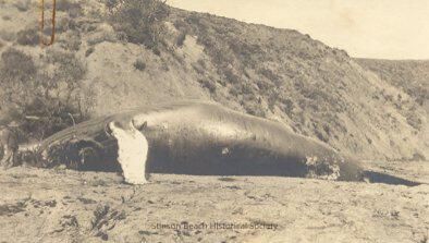 A black and white photograph of a beached humpback whale taken on Bolinas beach showing the cliff behind the Brighton Beach. The whale is on its back, the tail is almost at the surf. This photograph was attached to a letter for disposal of large animal sent to the Progressive Club of Stinson Beach. Written on the back with a pencil: J.H. Kuser M.D. Physician and surgeon, Whale @ Bolinas Beach.Collection