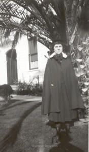 This black and white photograph shows a young woman (Mary O'Keefe) in a dark skirt and cape with a white collar (nurse's uniform of the early 20th century?) standing in front of a palm tree. There are a door and window of a house in the background.Collection