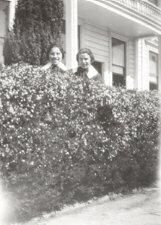 This black and white photograph is of two young women looking at the camera while standing behind a hedge so that they are visible only from the shoulders up. Broad white collars are at their necks. The woman on the left is Mary O'Keefe. There is a white building behind them showing windows and part of a balcony above.Collection