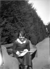 This black and white photograph is of a young woman sitting on a bench in front of a high cypress hedge. She has dark hair and is wearing a dark dress with a scalloped white collar and has what appears to be a writing board in her lap. She is hold a sheet of paper in her hands.Collection