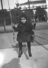 This black and white photograh is of a little girl sitting on a swing. She has dark hair and is wearing a dark bonnet tied under the chin with a big bow. She has on a dark long sleeved dress and black stockings and shoes. She holds the swing chain with both hands and is smiling at the camera.Collection