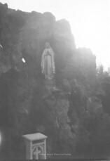 This black and white photograph depicts a Madonna perched on a ledge or niche of a rock outcropping. Below it at the bottom of the picture is part of a small structure with a flat top surface and a cross carved out of the lower portion.Collection