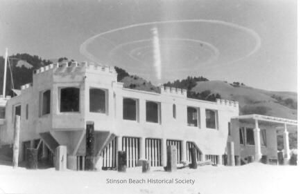 This black and white photograph is of a one story building on the beach with crenelation on the roof like a castle. There is a towerlike protusion at the near end on the left. The building is on pilings above the sand and the space between the pilings at the front of the building is fililled whith vertical bars forming a sort of grating. In the sky above the building are white concentric circles and a white vertical stripe which appears close to the center of the circles. It is not know what made these figures. The circles look like sky writing but the vertical stripe is a mystery. (See notes)Collection
