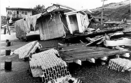 This black and white photograph shows a house broken apart. In the foreground at center and to the right are pieces of a brick chimney. There is another portion of the chimney behind the one at the center of the picture. Amid the chimney pieces is a section of floor boards behind which can be seen pieces of the house (walls, floors, roofing). Behind all this debris is the house itself, tipped off its foundation with walls and floors missing. Attached to the main structure is a covered back porch. Behind the wreck of the house can be seen a two story standing house. See notes.Collection