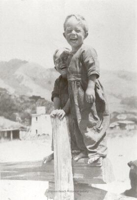 This black and white photograph shows two little boys who look to be 4 or 5 years old standing on the cross beam of a rail fence holding onto the vertical post. They are twins and are laughing. They are wearing rompers and are barefoot. There is beach and houses and hills in the background.Collection