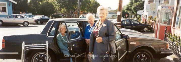 Wide-angle view of Mildred Sadler sitting in the back seat of a black Cutlass sedan (door open with Mildred facing out) and Annie Crotts (center) and Dorothy Mayfield (right) standing in front of the open front seat door. Annie, dressed in blue, is a retired Bolinas Postmaster and Dorothy, in gray suit with white brooch and red print blouse, is retired Stinson Beach Postmaster. Mildred is wearing a lacey turquoise sweater with light blue collar showing at the neckline and pearls. The car is parked in front of the [old] Stinson Beach Library (only the grillwork is visible). Beyond that is the red telephone booth and shopfronts (with another black car parked in front of them) and stop sign at the intersection on the right. A corner of the Stinson Beach grill with cars parked in front and to the side is visible on the left.Collection
