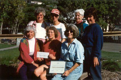 Village Green Neighborhood Award is displayed by a group of women seated in the corner of Village Green. Seated (L to R): unidentified silver-haired woman in red sweater and white turtleneck, Suzanne Duerden holding an envelope-size paper, Carol Wagner holding framed plaque. Standing (L to R): unidentified gray haired woman with glasses, Susan Ackerman in red & white cap, unidentified woman with upswept white hair, and unidentified dark-haired woman in navy blue sweatpants suit.Collection