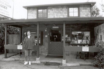 B&W photo shows Annie Rand in pullover sweatshirt and jeans, white turtleneck and tennis shoes, standing in front of Stinson Beach Books. The bookstore, located at 3455 Shoreline Highway, is a wooden structure with a porch area enclosed by wooden planters. The upper portion of the half-door is open. A second story has two windows.Collection