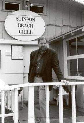 B&W photo of Tom Horton standing on the deck outside the Stinson Beach Grill. His wearing a dark open-neck shirt and sport coat with tan slacks. His left arm is resting casually on the wooden railing of the ramp/stairs leading up to the entrance of the restaurant. Beside the (closed) front door is posted a framed menu. Over the door is a white oval sign with STINSON BEACH GRILL written vertically in black letters. Twin spotlights shine down on it. There is a window into the restaurant on the right side.Collection