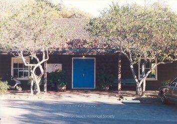 This color photo is of a low brown building with a blue door. To the left of the door is a bulletin board and there is a six paned window on each side of the door. There is a walkway running in front of the building paralleling the road in front. Between the road and the walkway are two small trees, one on each side of the door. The building is the Stinson Beach Community Center. See notes.Collection