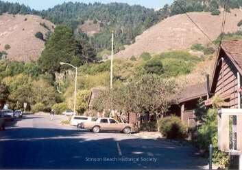 Looking up Belvedere Street towards the hillside (which is brown but dotted with green trees and bushes) from Highway One. Cars are parked diagonally in front of the Community Center. In the foreground on the right is the side of the Fire Station, with a open phone booth on the corner. Trees in front of the Center block the view of the Church. There is a single pedestrian walking in the road. Some cars are parked parallel on the left side of the street.Collection