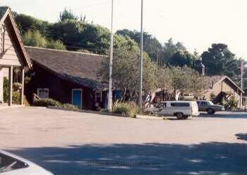 South side of Belvedere Street looking towards Hwy One. Visible is the tip of the church, near its entrance, and long view of the Community Center and Firehouse. Two cars are parked in front of the Community Center. Trees cover the rear.Collection