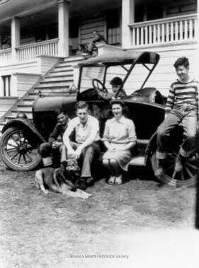 This black and white photograph is of what appears to be a Ford model A roadster with 5 teenagers posing in and around it. There is a boy in the driver's seat, 2 boys and a girl sitting on the running board and a boy sitting on the back fender. There is a dog lying in front of the people sitting on the running board. The car is parked in front of steep steps leading to a veranda of a large white building. There is a man sitting on the veranda. For i.d. of the people and building please see notes.Collection