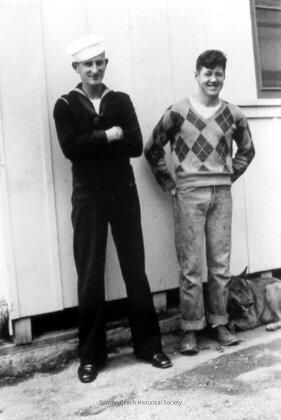 This black and white photograph is of two young men. They are standing against the white wall of a building. The one on the left (Robert Airey) is a sailor in uniform. The one on the right (Kenny Mayers) has dark hair and is clad in blue jeans and an argyle pullover sweater. Both are looking at the camera and smiling. A dog is lying beside Kenny. He is the Airey's Tawny.Collection