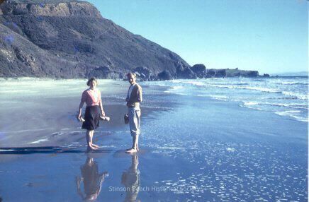 Bert and Joan stand barefoot on the south end of Stinson Beach near the surf line. They are holding their shoes in their hands. She is in a dark blue skirt with a pink sweater and white blouse. He is in light rolled-up pants, grey sweater and white t-shirt. The rocks fill the background as a light foamy surf rolls in.Collection