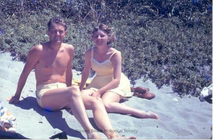 Otto and Joan sit side by side in the sand with the dune grasses behind them. She is wearing a one-piece yellow bathsuit that has a skirt. He is in similarly colored bathing trunks.Collection