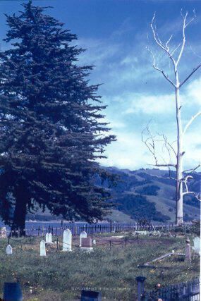 This color photograph is of a picket fenced area with a scattering of tombstones at Bolinas Cemetery. There is a tall evergreen tree on the left and a tall white dead tree on the right. Blue water of the lagoon can be seen beyond the cemetery and beyond that the coastal hills. The sky is blue with some clouds above the hills.Collection