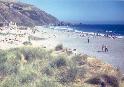 This color photograph is a view of the beach(on Bolinas Bay) looking south toward San Francisco. It is taken atop a dune covered with dune grass, looking down on the beach. At the left can be seen a life guard tower with someone seated on it. In the left background are the steep hills going down to the water and the big rocks at their foot. Highway 1 is visible halfway up the hills. The beach has quite a few people on it, some down by and in the water. It is a clear day with blue sky.Collection