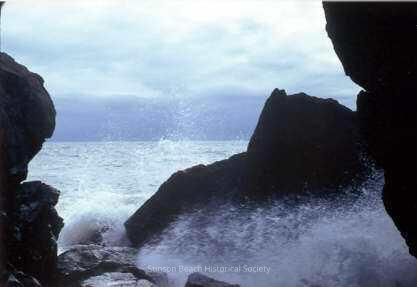 This color photograph looks out toward the ocean from among large rocks. The rocks frame the photograph on both sides and there is another large rock in between them reaching up to above the horizon on the right. The sky is overcast and there is a wave breaking on and around the center rock sending up a white spray.Collection