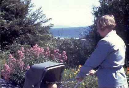 This color photograph is of a woman with short brown hair and wearing a blue jacket. She is pushing a baby buggy. The lower portions of the buggy and the woman are cut off so just the top of the baby's head and the woman from the hips up are visible. There are pink flowers growing behind the buggy and some yellow flowers also. There are trees at either side of the photo framing a view of the ocean in the background. The woman is Joan Reutinger and the baby is her son Martin.Collection