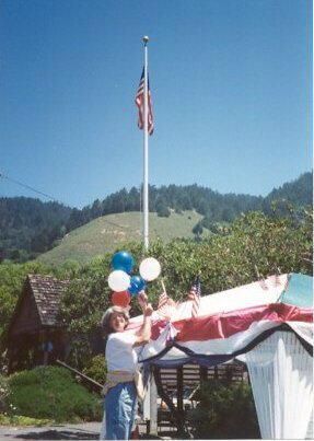 Carol Wagner holds aloft red, white and blue balloons in front of an outdoor tent of the same colors set up in front of the community center. Behind her a flagpole, the roof of the church partially obscured by tall bushes, and the hillside crested with trees are visible. She is in a white shirt and jeans with a beige sweater wrapped around her waist.Collection