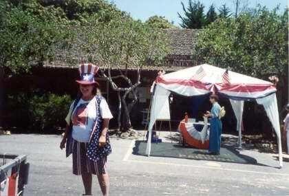 Celeste Washington, dressed in red, white and blue top hat and blue with white polka dot vest over a white t-shirt and striped skirt, stands in front of the Community Center. Behind her is a white outdoor tent trimmed in red with American flags set up in the parking space in front of the building. Susan Ackerman, in profile, stands before a table draped with red, white and blue. Susan has on a long denim skirt and lighter blue shirt with a sun hat hanging on her back.Collection