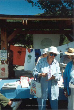 This color photo is of a portion of the same table described in #1996-157-01 and the shirts hanging behind it. A lady in blue slacks, a light blue shirt and hat and sun glasses is standing in front of the table looking at some pages in her hands. She is Peggy Pepper. Another woman is partially visible at the right edge of the picture.Collection