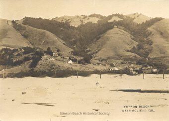 Sepia toned postcard circa 1910 shows the Stinson Beach hillside from the beach. The white sand in the foreground is separated from the residences on the hillside by a line of wooden posts. Two or three houses appear to be directly on the beach, most of the others are built on the hill. Trees cluster in the clefts of the hillside. In the righthand bottom corner is printed STINSON BEACH, NEAR BOLINAS, CAL. Peggy Pepper is written on the back in ink as well as circa 1910s, and a sticker on which is written September.Collection