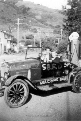 This black and white photo is of an old roadster automobile. It is a two seater with no top or side windows visible, only a front windshield. There are two young men in it. The car has writing all over it. It says 'Welcome Babes' just above the running board. It has the letters SBFD and SPCA written on the side and 'Blitz Buggy' written on the side of the hood. Just behind the car are some old gas pumps. A road, buildings and hills can be seen in the background. See notes for more details.Collection