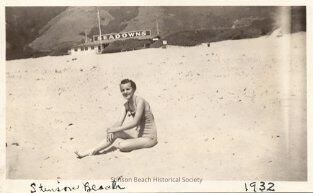 This black and white photograph has faded to sepia tones. It is of a slender young woman seated on the sand. She has short hair, is wearing a bathing suit and is smiling at the camera. Upslope and behind her is a low building with the sign 'SEADOWNS' on the roof. There are hills rising behind the building. See notes.Collection