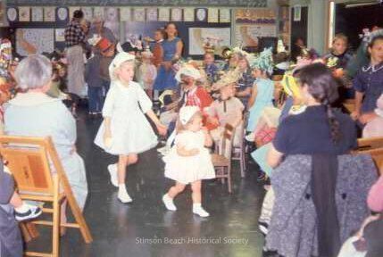 This color photgraph is of a schoolroom filled with people. There is a blackboard stretching across the back wall with maps and pictures attached to it. People are sitting on folding chairs which are placed on either side of an aisle. Two little girls are walking in the aisle toward the camera. They are dressed all in white: white shoes and socks, white dresses and white hats.Collection