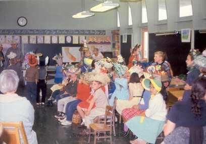 This color photograph is of children sitting in chairs facing an aisle leading to the back of the room. They are wearing fantastic hats. One boy standing at the back of the room is wearing a red 'Mad Hatter' hat. Another boy is wearing a sombrero. There is a girl in a blue and yellow bonnet and someone in a multicolored cone-shaped hat. A blackboard stretches across the back wall with a clock above it.Collection