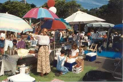 Colorful view of tables, mostly covered with blue checkerboard cloths, laden with goods, rows of umbrellas of various hues sheltering the tables, and people (mostly with backs to camera) standing by tables. Plus two young girls kneeling at a blue and white cooler on which they seem to be drawing.Collection
