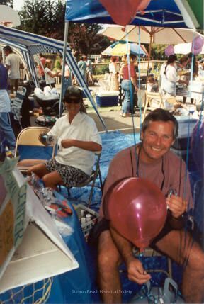 Kevin Hicks sitting on a folding chair holding a red balloon under a blue umbrella tent. A folding box shows that it is the SB Medical Center kiosk. Susan Kelley, white shirt and blue patterned shorts sits behind him holding ribbon. Seems like they're in process of filling balloons with helium. More of the fair is visible in the background.Collection