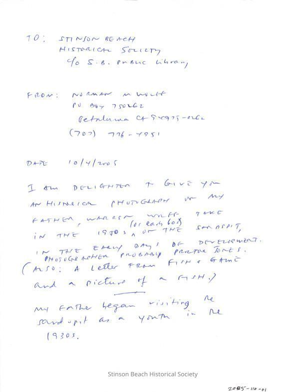 A hand written letter from Norman Wolff to Stinson Beach Historical Society noting the gift of historical photograph of his father, Warren, who resided at Seadrift at the time of his death in late 1990s. See 2005-110-02, 03Collection