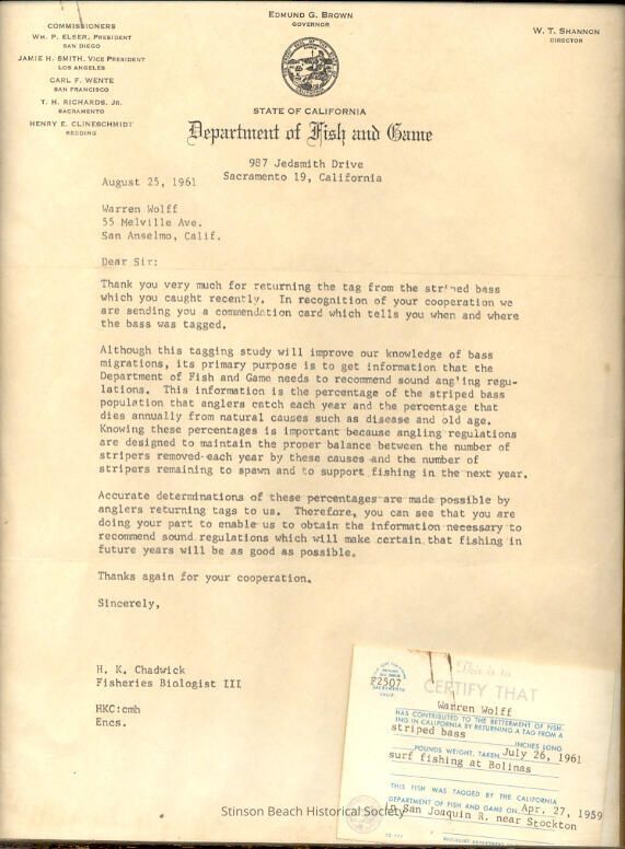 A letter from Dept. of Fish and Games to Warren Wolff dated August 25, 1961 in response to his returning a tag from a striped bass he caught on July 1961 surf fishing at Bolinas. The letter commend him as a contributor to the betterment of fishing in California and explains the purpose of tagging. The letter is framed in a thin black frame. See 2005-110-01, 02.Collection
