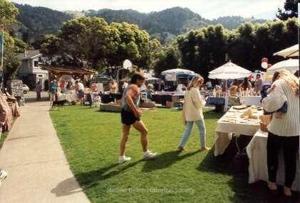 This color photo shows a cement pathway running down the left side of the picture with an expanse of green lawn to the right. There are tables with umbrellas at the back of the lawn curving around to the right edge of the photo. There are people at and about the tables. A man and a woman are walking across the lawn in the foreground heading toward a table on the right. He is wearing shorts and a tank top. She is wearing blue jeans and a cream colored shirt. There are trees in the background behind the tables and mountains behind the trees.Collection