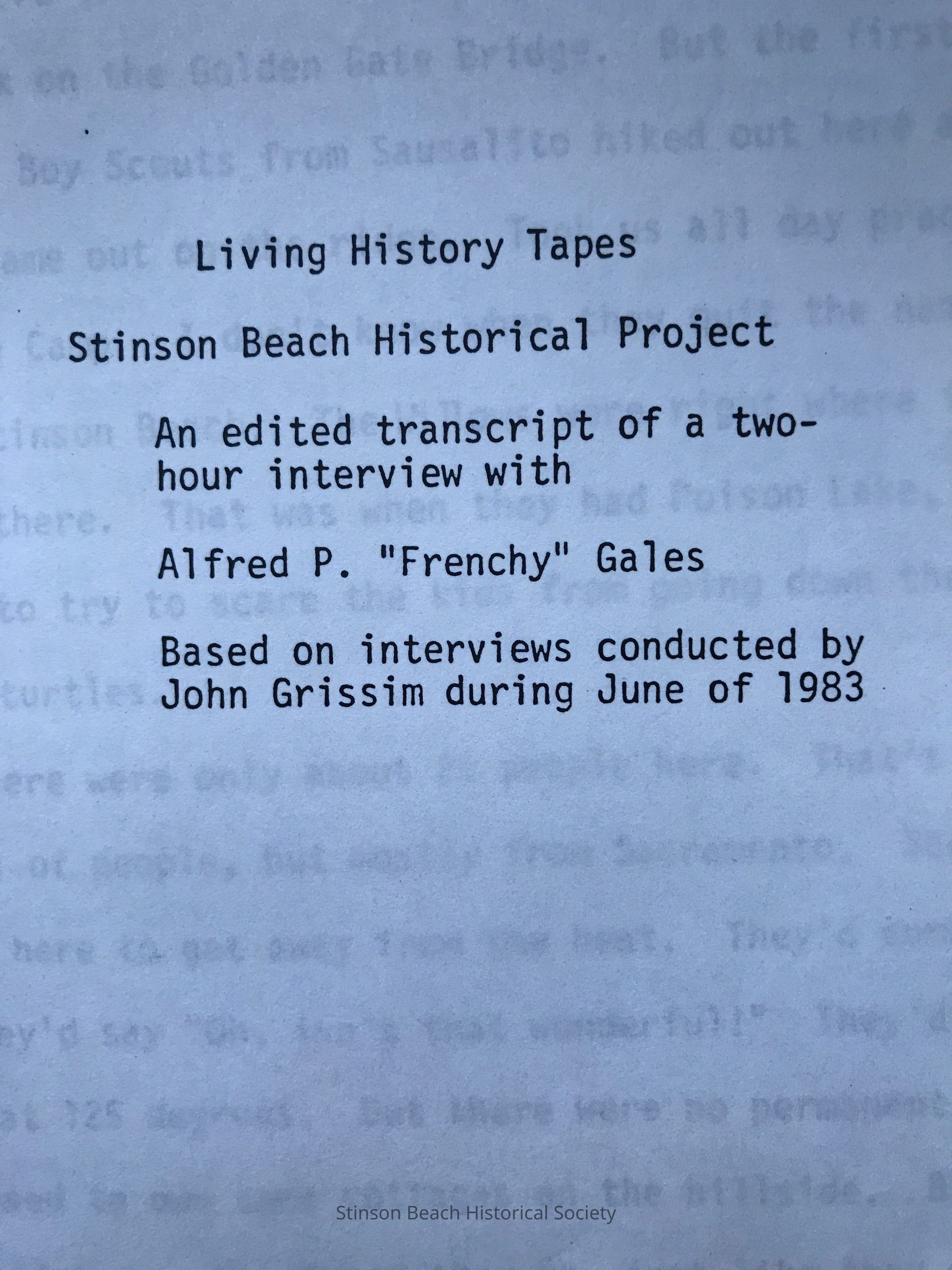 Frenchy describes coming out to Willow Camp with the boy scouts in 1917, working to build the Golden Gate Bridge, driving the Stage and then the bus between Sausalito and Stinson Beach, and hunting and fishing in the area.