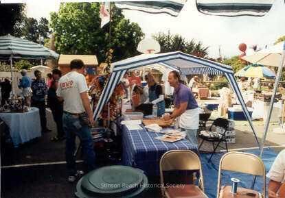 This color photograph is of tables set up with umbrellas/shades. On the left is a table with a blue cloth and a blue and white striped umbrella. To the right and center is a table with a blue and white check cloth and a blue and white striped shade structure. There is a man in a purple shirt with a white towel/apron tied around his waist behind the table to the right. A man in in jeans and a white T shirt is standing on the other side of the table with his back to the camera. There are booths and people in the background and the top of a garbage can and 2 folding chairs are partially visible in the foreground.Collection
